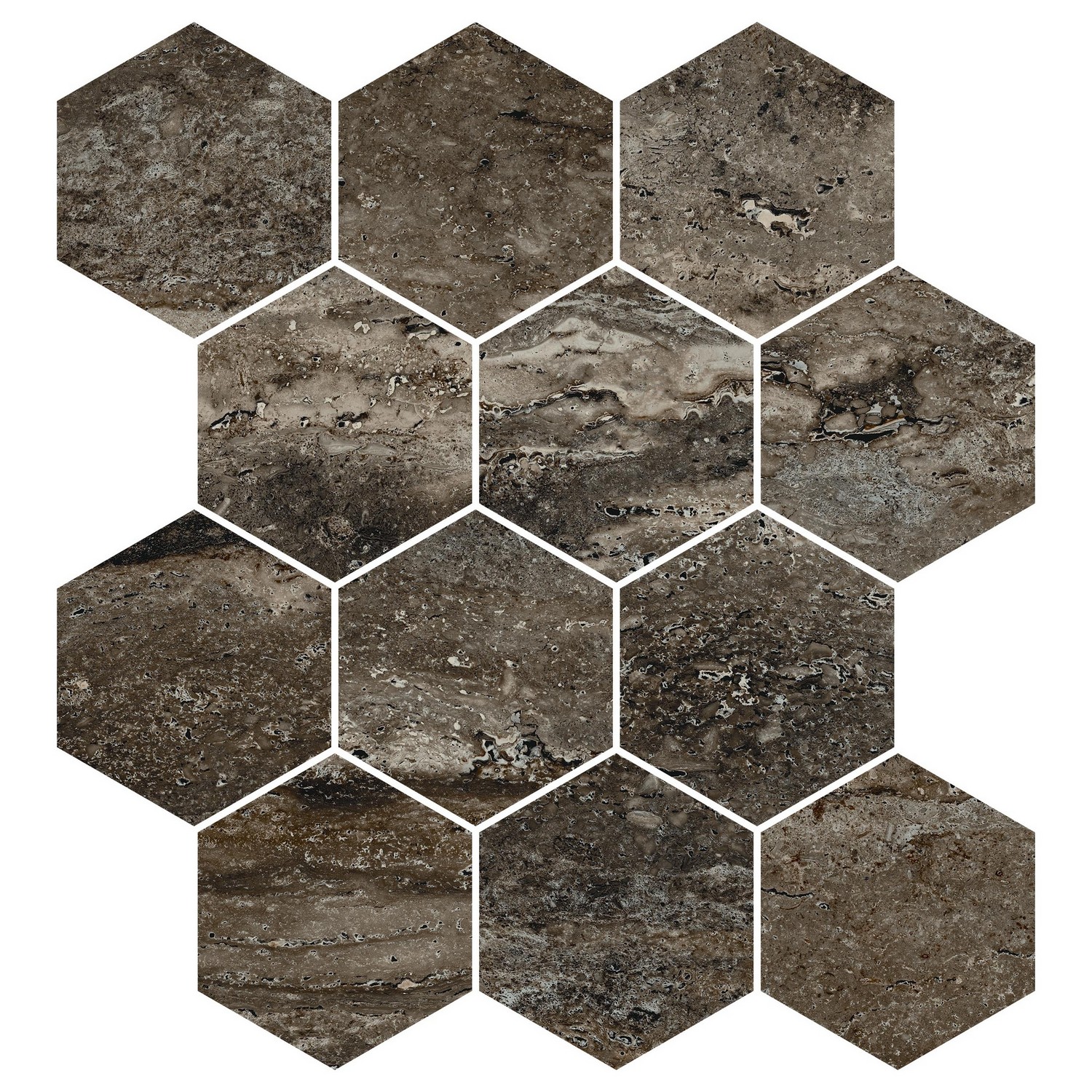 Travertino / Titanium / 3" Hex Mosaic / Polished